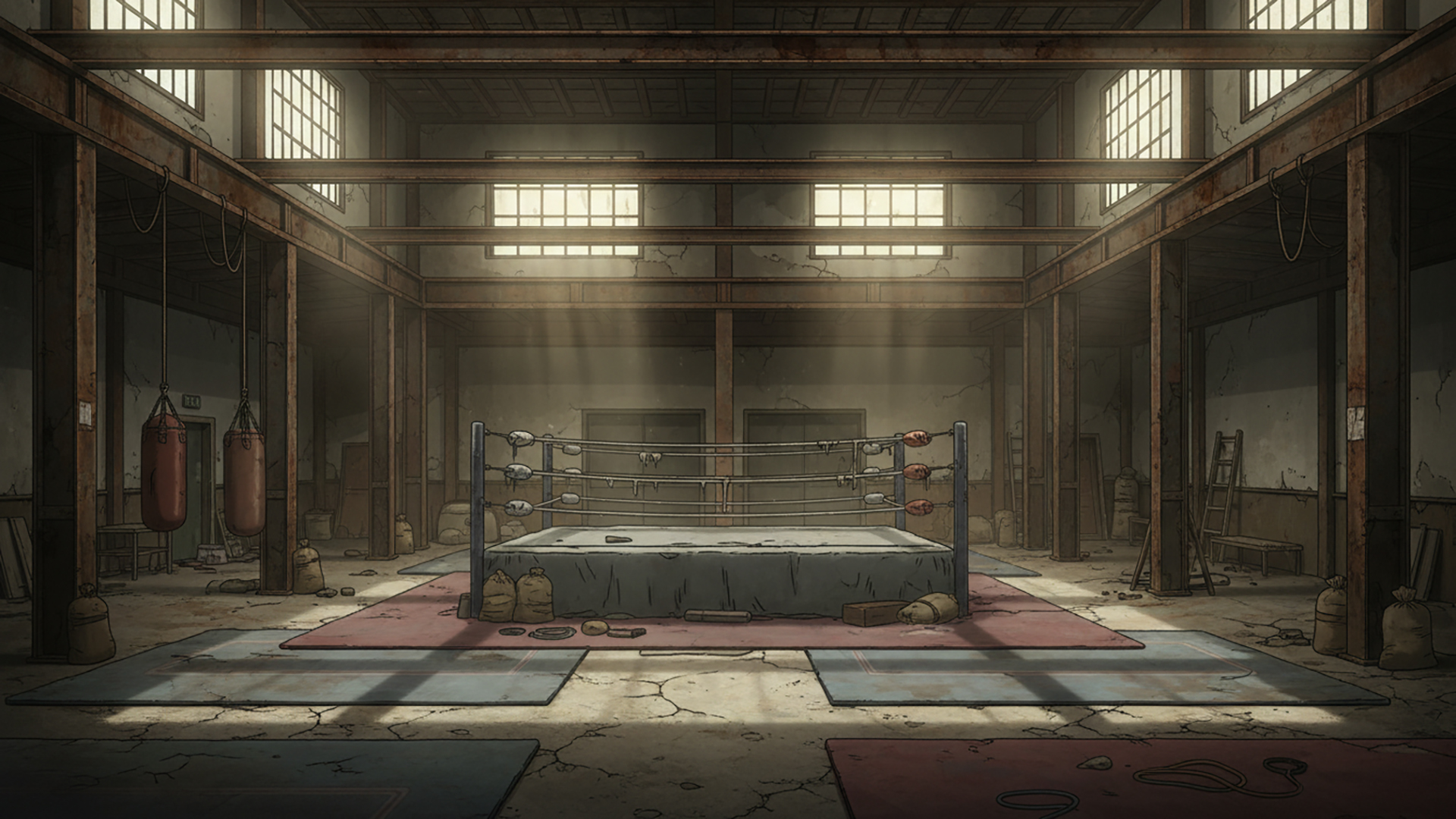 検索キーワード:プロレス道場, 練習場, 格闘ジム, マットエリア, 道場内装, トレーニング場, wrestling dojo, training gym, fight studio, mat area, dojo interior, practice room