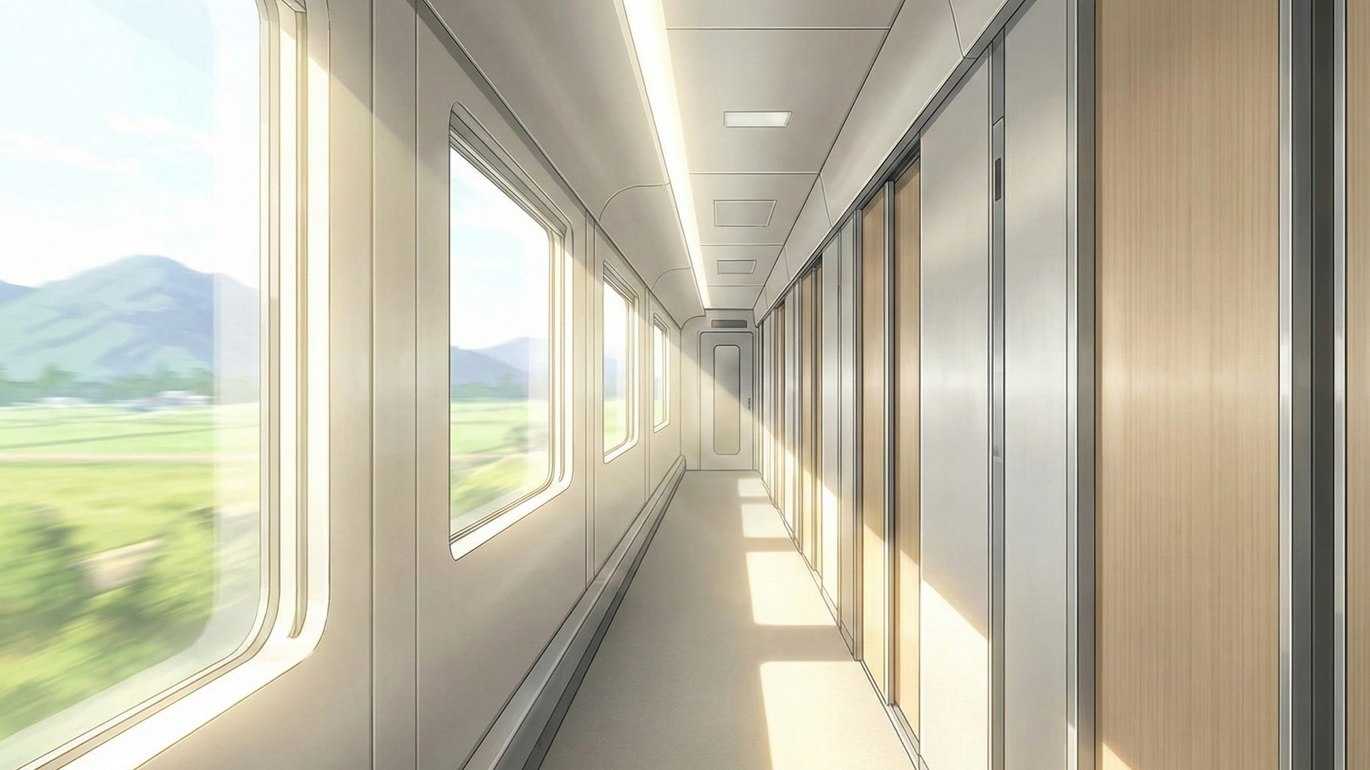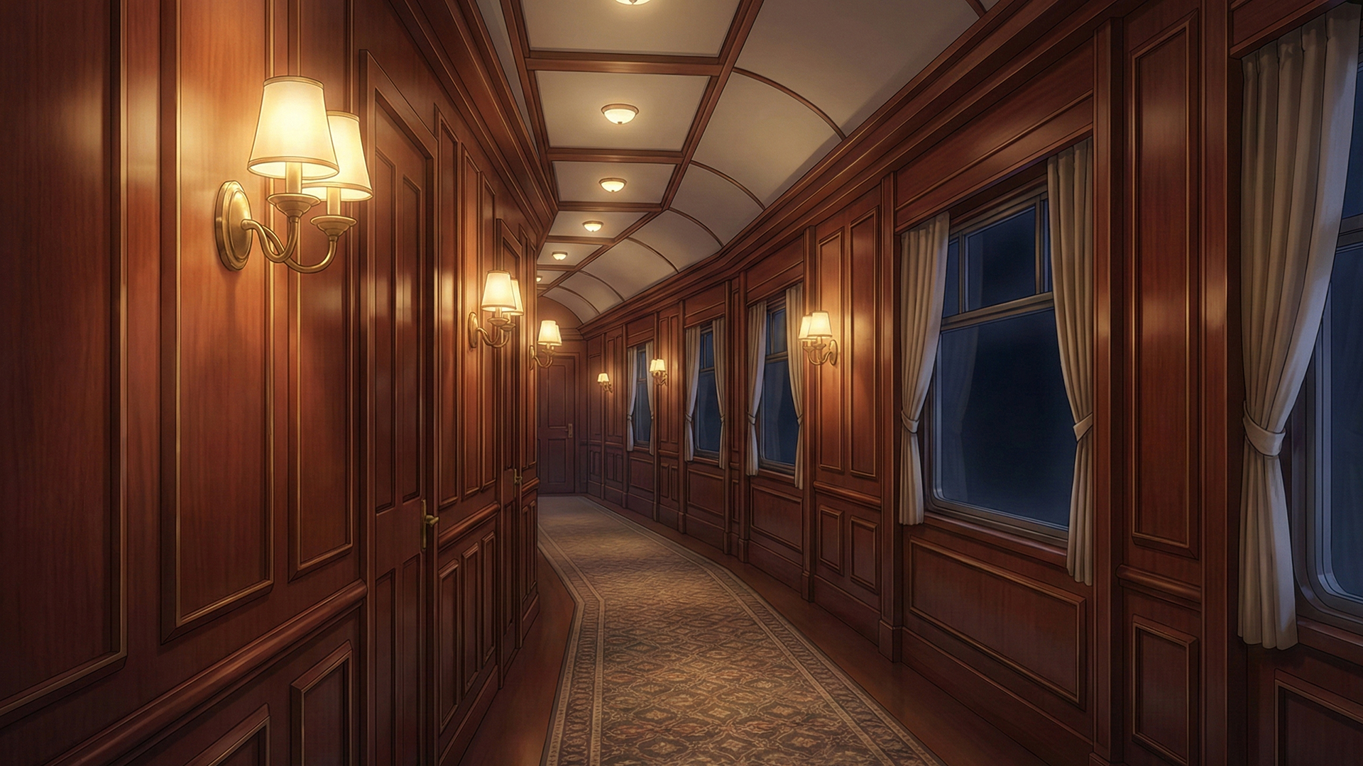 検索キーワード:寝台列車, 夜行列車, 廊下, 通路, 車内, 鉄道, 旅情, 静寂, 窓辺, ノスタルジー, Sleeper train, Night train, Corridor, Hallway, Train interior, Aisle, Railway, Atmosphere, Moody, Travel