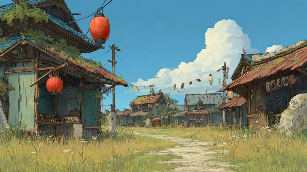夏祭りの廃村|壊れた提灯と荒れた屋台(3枚)