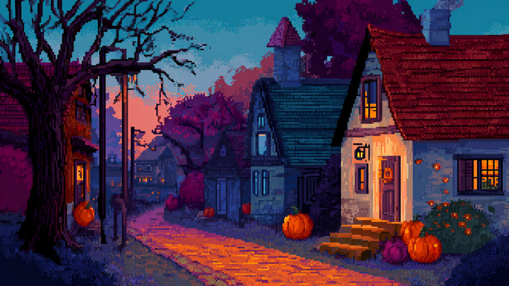 ドット絵風|ハロウィンの村背景素材(3枚)