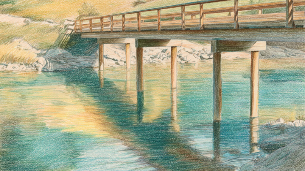 色鉛筆風-橋のある風景|手描き風の川辺イラスト(3枚)
