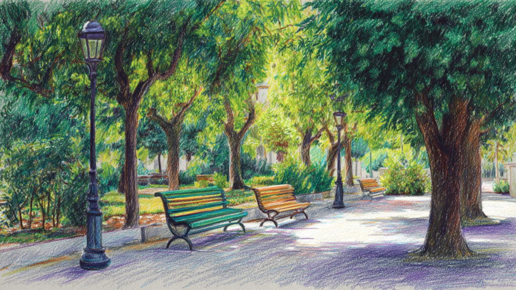 色鉛筆風-公園背景素材|手描き風ベンチと木々の風景(3枚)