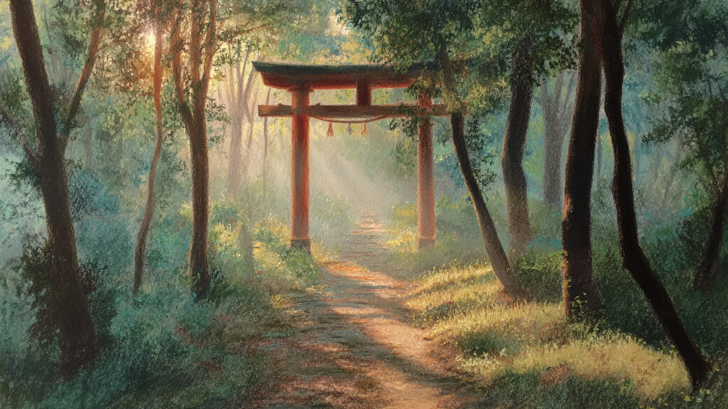 色鉛筆風-森の神社参道|手描き風の幻想的な朝(3枚)