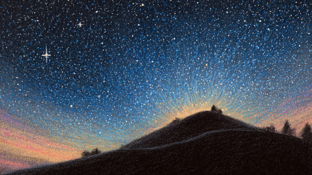 色鉛筆風-星空の丘背景素材|手描き風の夢幻的夜景(3枚)