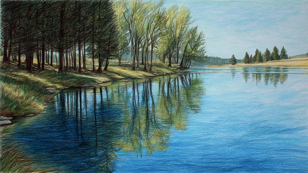 色鉛筆風-水辺背景素材|湖・川の手描き風風景(3枚)
