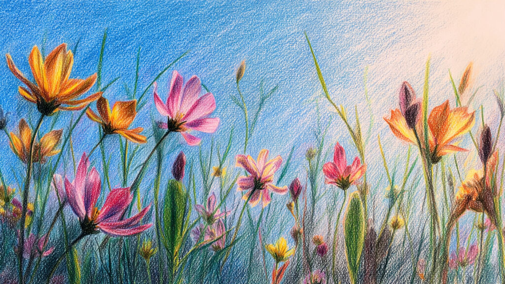 色鉛筆風-花畑背景素材|手描き風の春の風景(3枚)