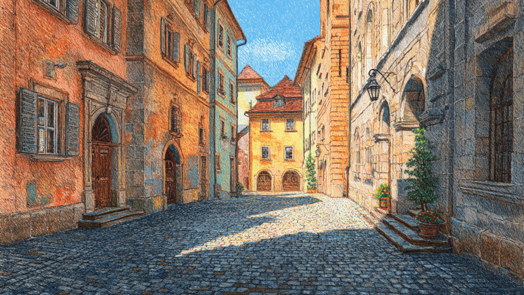 色鉛筆風-西洋風街並み背景|手描き風ファンタジー風景(3枚)