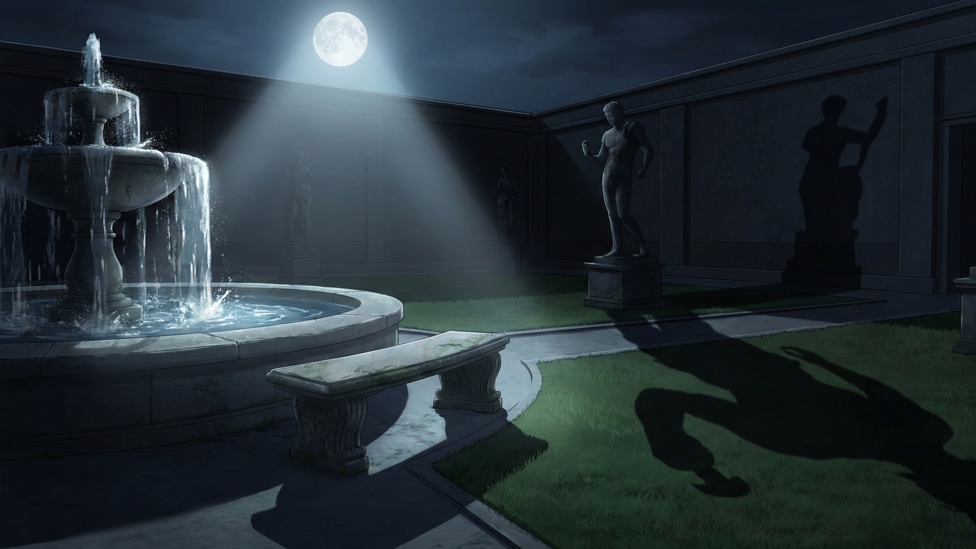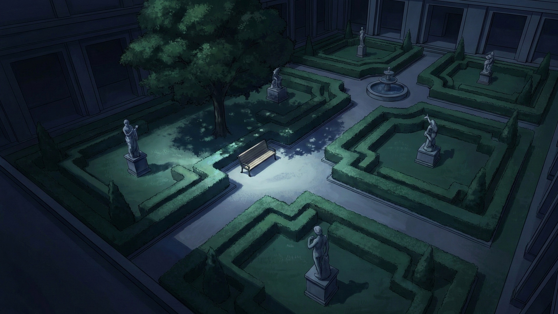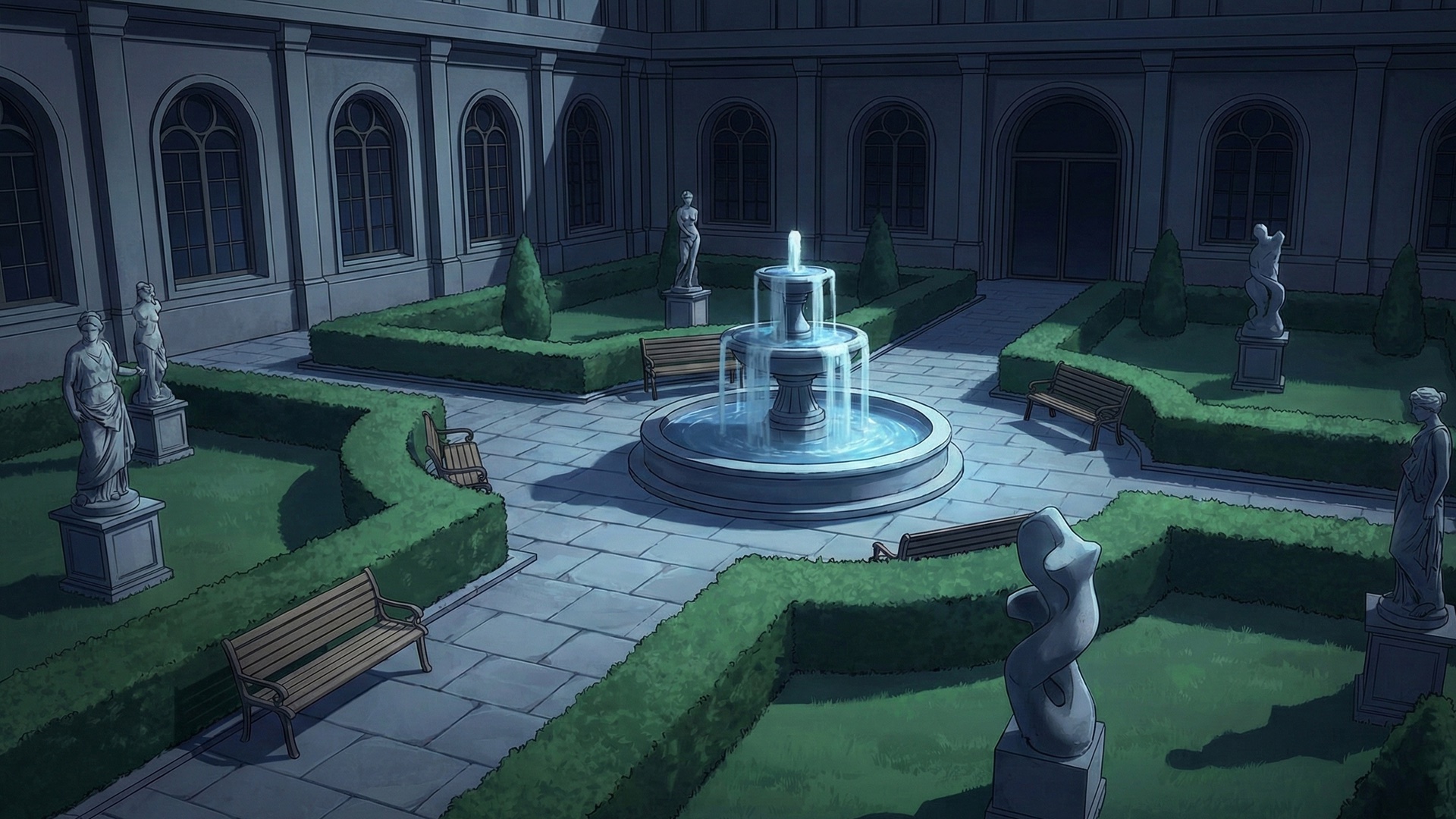 検索キーワード:夜の美術館, 博物館, 中庭, 彫刻庭園, ナイトミュージアム, ライトアップ, 幻想的, 芸術鑑賞, 静寂, 散歩, 夜景, night museum, art gallery, courtyard, sculpture garden, outdoor sculpture, night view, illumination, moody lighting, art installation, atmospheric, landscape design