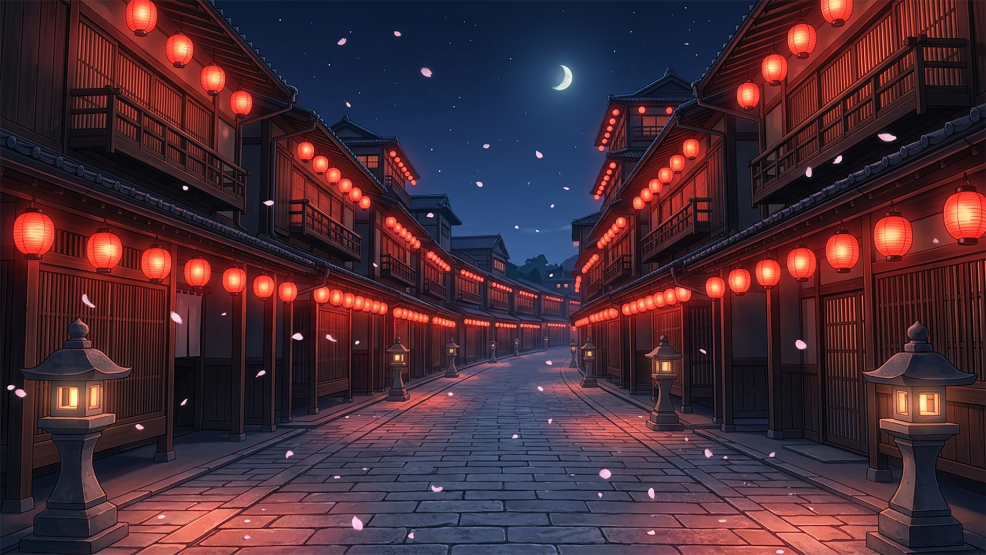 検索キーワード:遊郭, 街道, 夜道, 賑わい, 灯籠, 江戸, Pleasure Quarter, Street, Night Road, Bustle, Lanterns, Edo Era