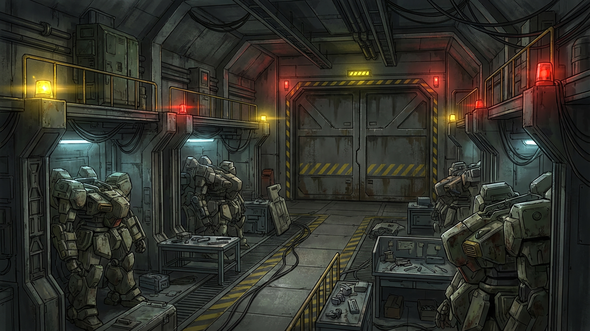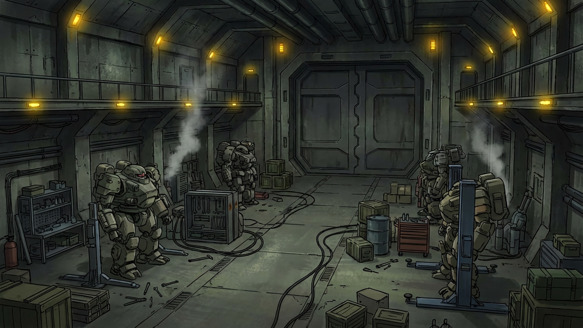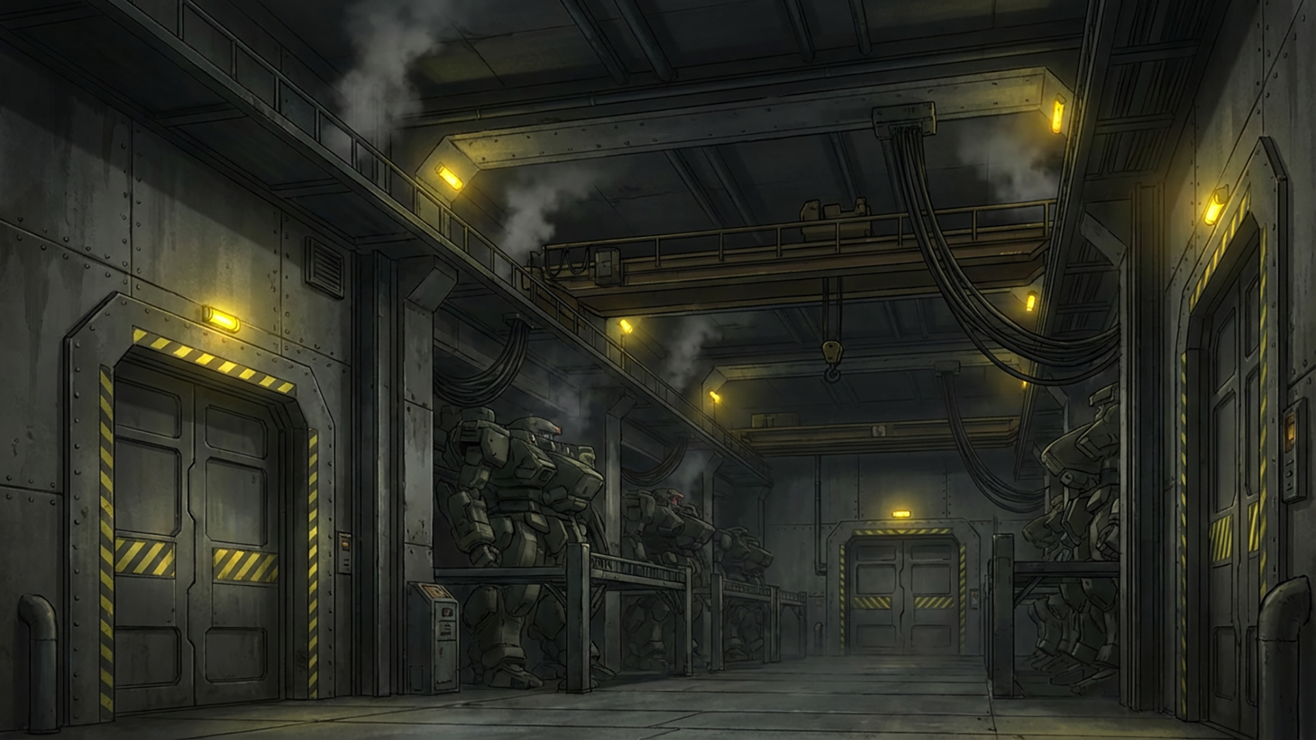 検索キーワード:地下,メカ格納庫,工業施設,機械,暗所,巨大構造, underground, mech hangar, industrial facility, machinery, dark space, massive structure
