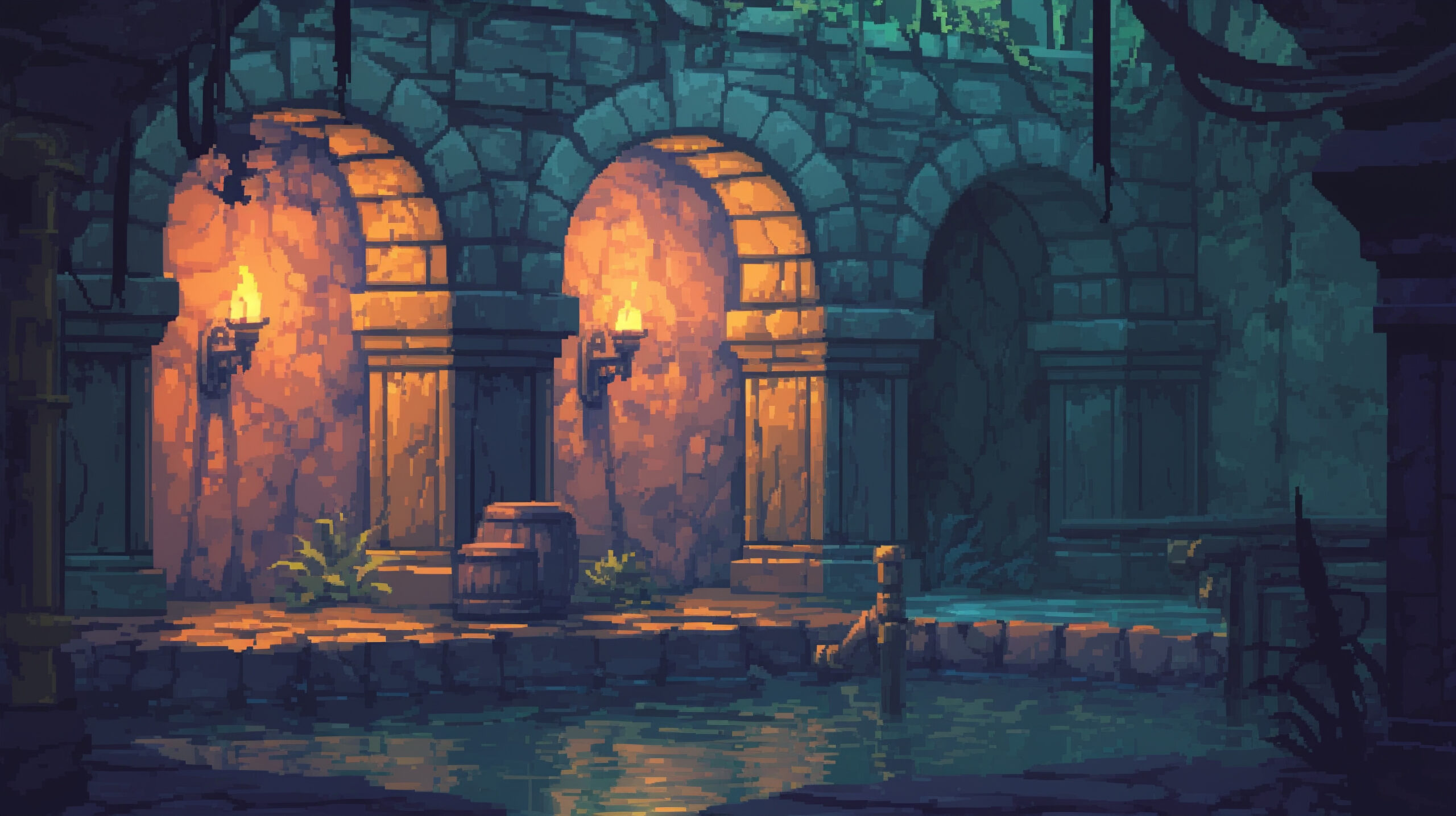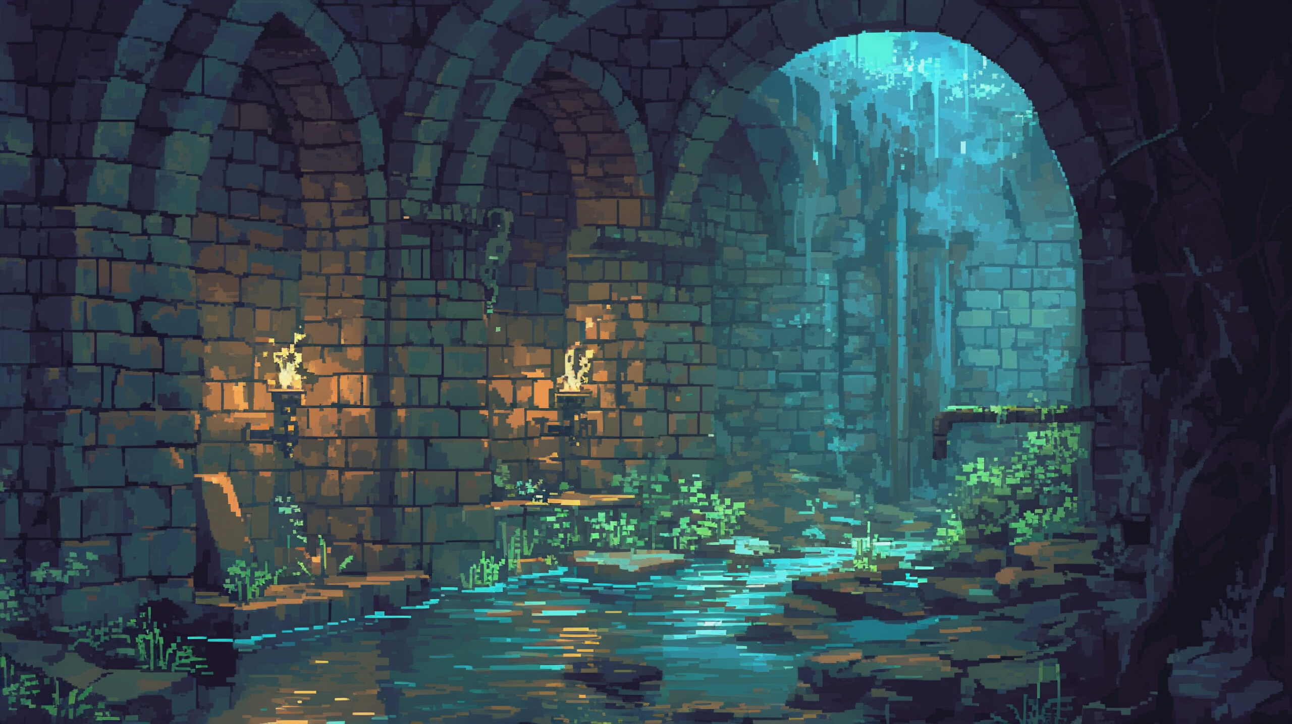 検索キーワード:地下水路, 戦場, 水, 石壁, ファンタジー, ドット絵, underground canal, battlefield, water, stone wall, fantasy, pixel art