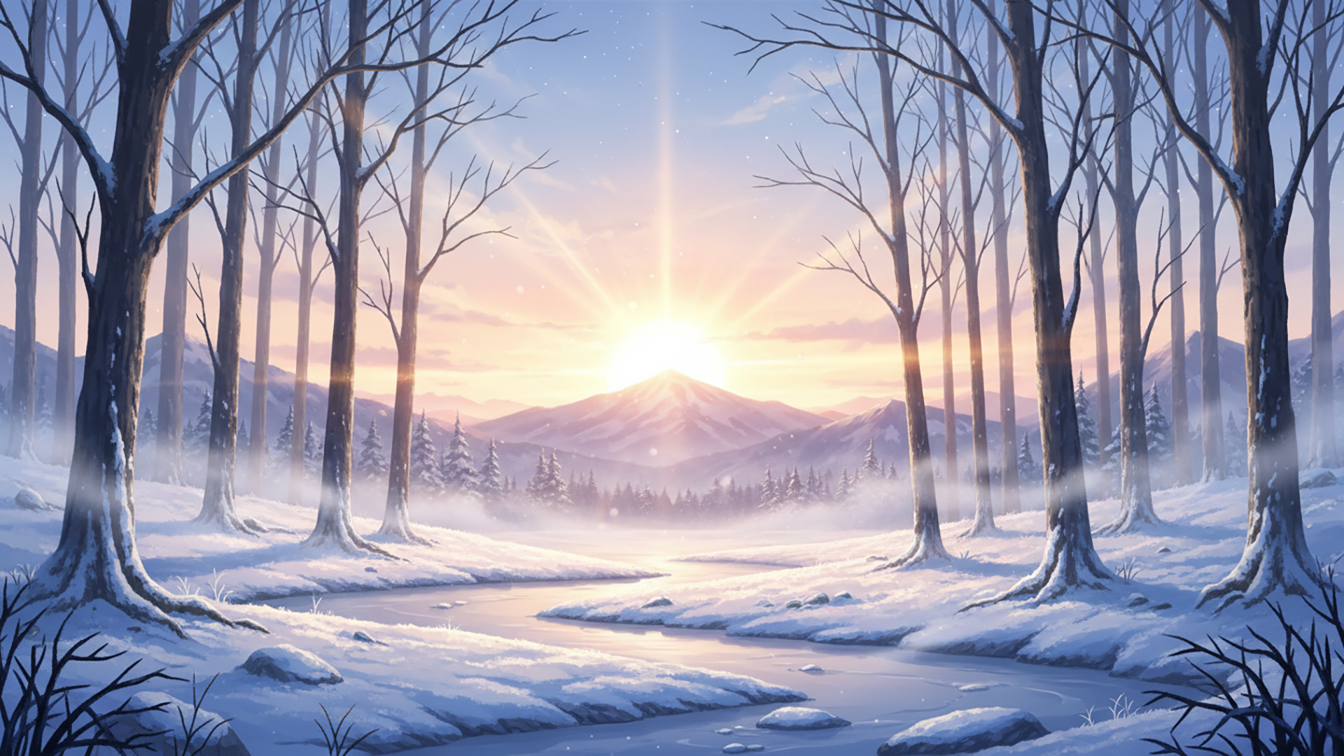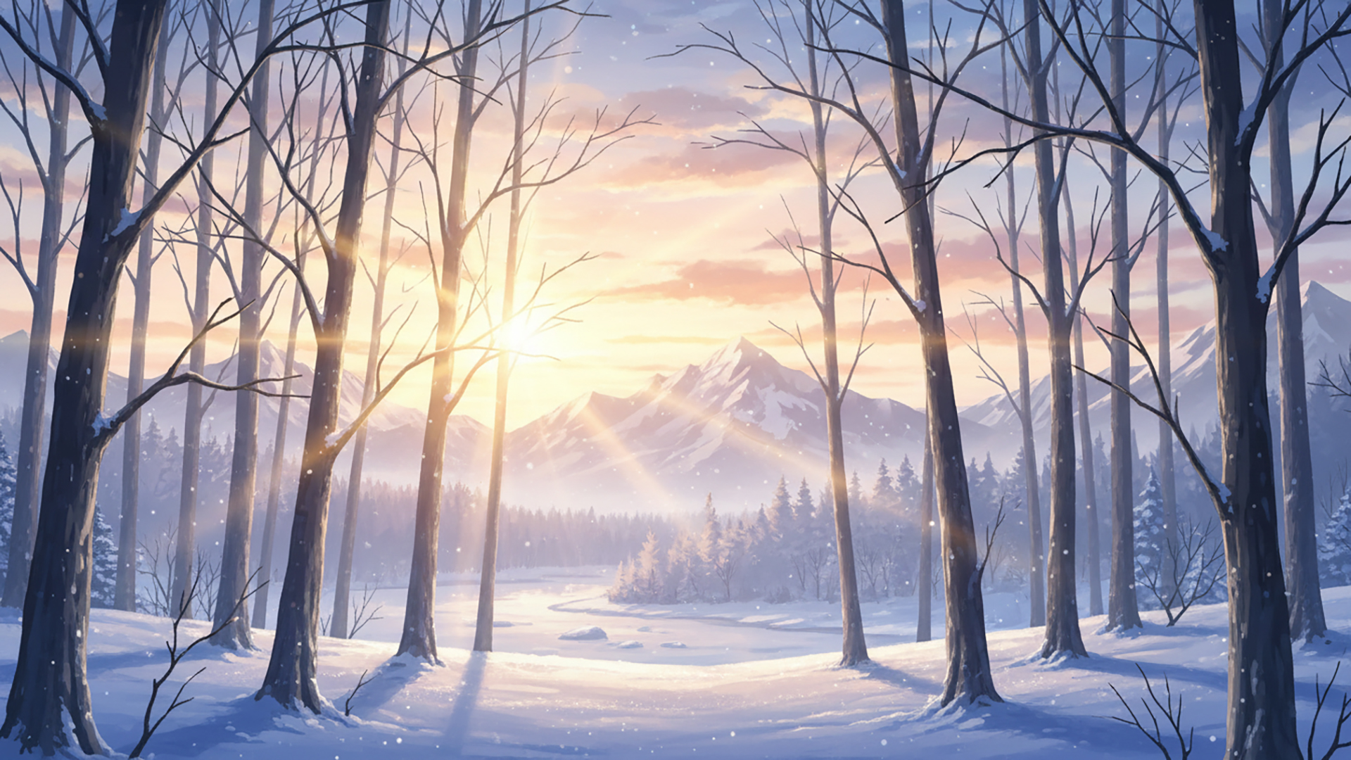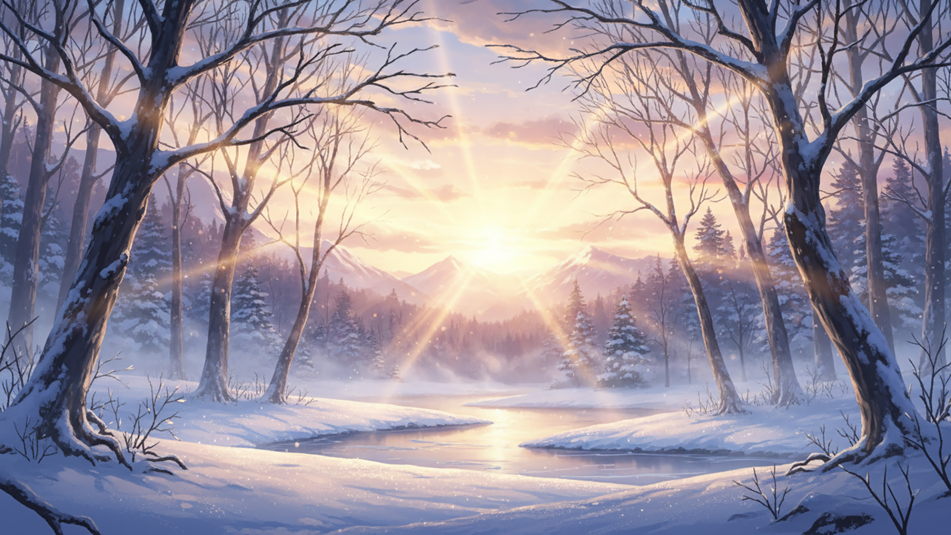 検索キーワード:冬,森,日の出,雪景色,朝光,静寂, winter, forest, sunrise, snowy landscape, morning light, silence